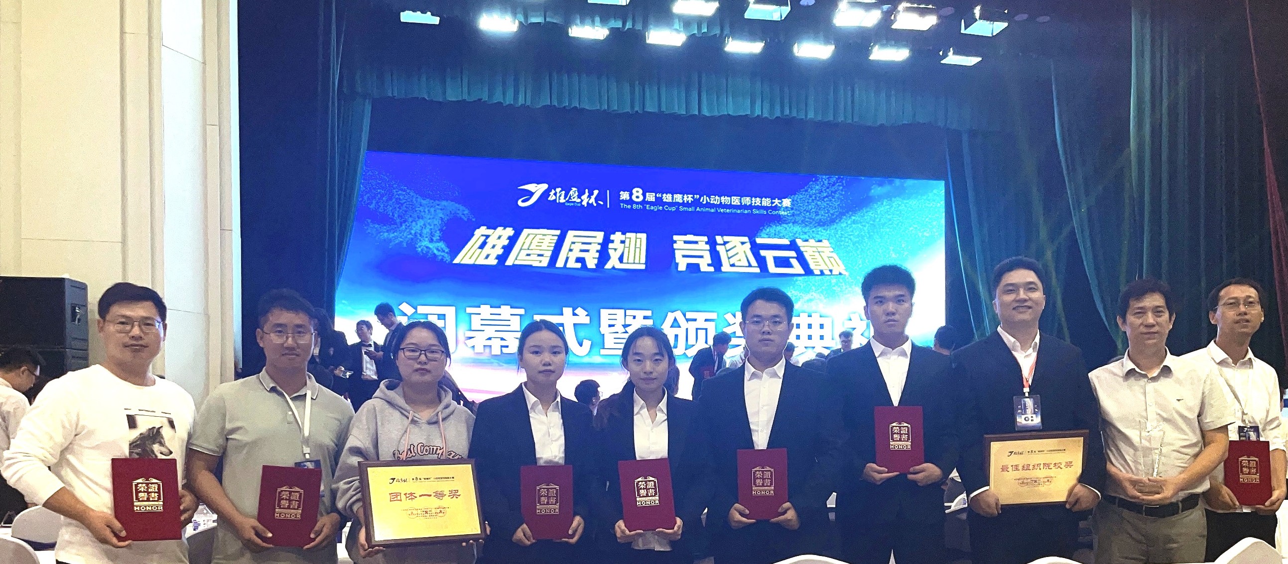 9月13日-15日第八届“雄鹰杯” 小动物医师技能大赛在吉林大学召开。本届大赛共有来自全国118所高等农林院校、1000余名参赛选手参加。副院长韩立强带领我院动物医学专业师生共10人参赛,经过奋力拼搏,最终学生代表队荣获团体一等奖,代宏宇、黄淑成、童超三位老师荣获优秀辅导老师一等奖,学院荣获最佳组织院校奖。