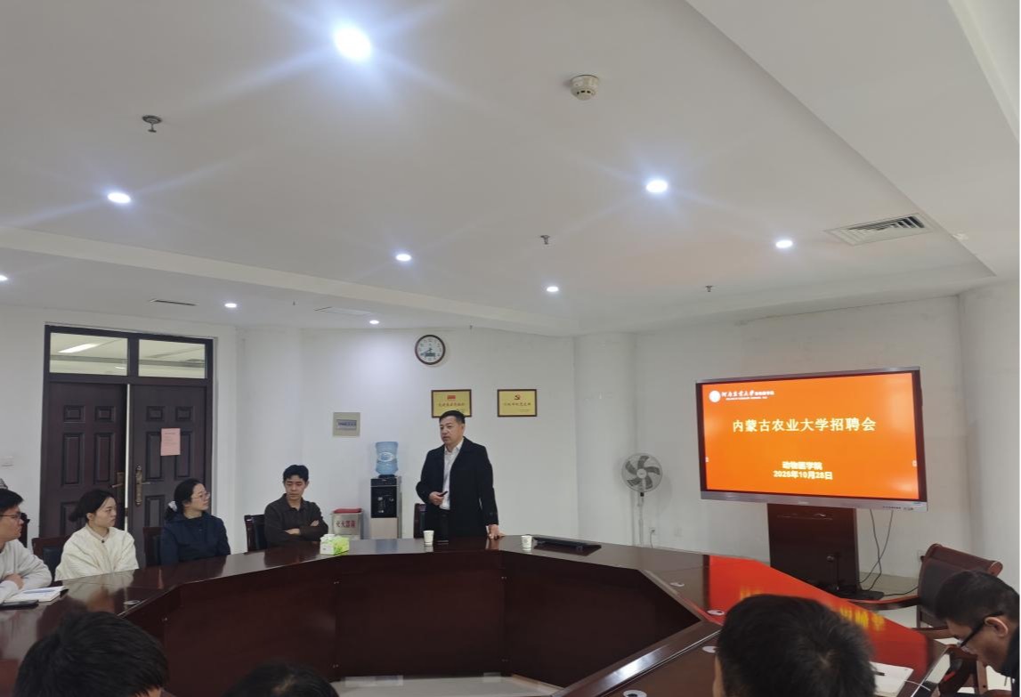 随后,内蒙古农业大学兽医学院副院长包福祥进行招聘宣讲。他全面介绍了内蒙古农业大学的独特优势,从内蒙古悠久的历史文化、自治区及学校优厚的人才政策、学院的人才队伍建设情况到交通、饮食、购房等生活便利条件。包院长特别指出,内蒙古农大兽医学院不仅在传统的牛、马等研究方向上需要人才,在猪病、药理学及新兽药研发等领域同样迫切需求人才。