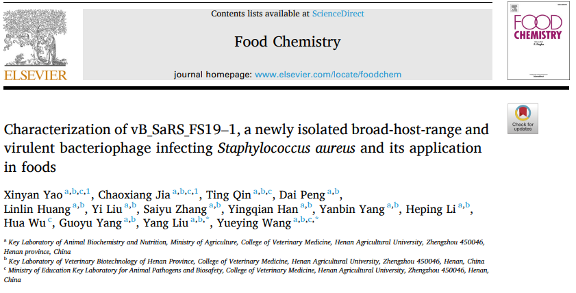 近日,我院农业农村部动物生物化学与营养重点实验室、河南省兽医生物技术重点实验室、动物病原与生物安全教育部重点实验室杨国宇教授和王月影教授课题组在国际著名期刊《Food Chemistry》(中国科学院一区TOP期刊)发表题为“Characterization of vB_SaRS_FS19-1, a newly isolated broad-host-range and virulent bacteriophage infecting Staphylococcus aureus and its application in foods”的研究论文。通过以多重耐药金黄色葡萄球菌为宿主菌,分离获得金黄色葡萄球菌噬菌体。研究表明,该噬菌体潜伏期短、爆发量大、宿主范围广,对极端环境条件的耐受性强。全基因组序列分析不含与tRNA、毒力因子、抗生素耐药性及溶原相关的基因,且以剂量依赖性的方式抑制或杀灭金黄色葡萄球菌,为噬菌体在金黄色葡萄球菌中的防控奠定了基础。