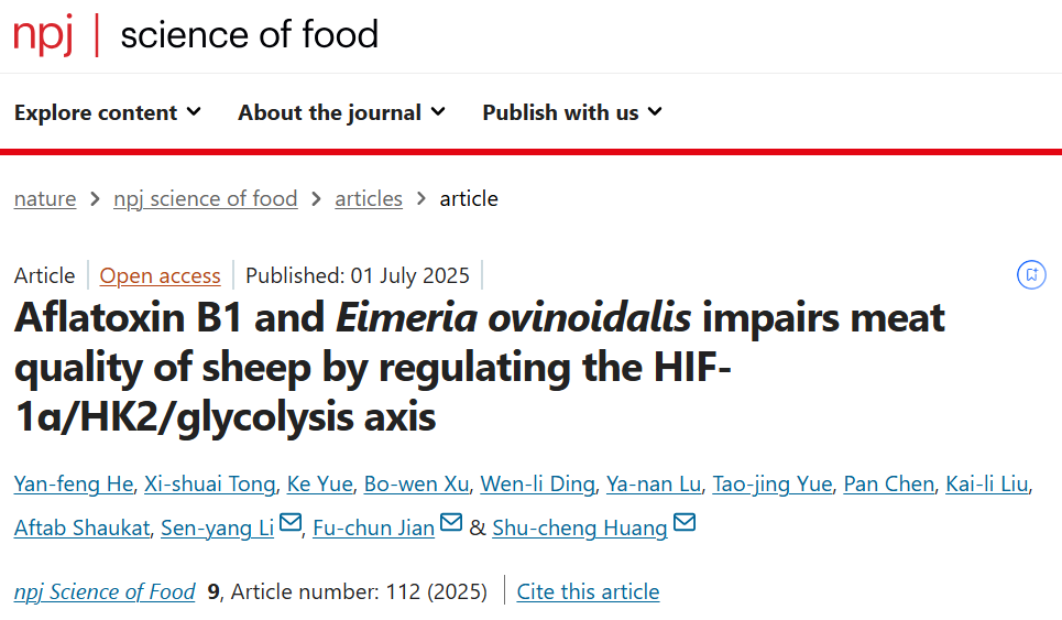 近日,我院菅复春教授团队在国际权威期刊《npj Science of Food》(中科院一区,影响因子 7.8)在线发表题为 “Aflatoxin B1 and Eimeria ovinoidalis impairs meat quality of sheep by regulating the HIF-1ɑ/HK2/glycolysis axis” 的研究论文。该研究首次系统阐明了黄曲霉毒素 B1(AFB1)与类绵羊艾美耳球虫(E. ovinoidalis)联合作用对羊肉品质的损伤机制,为肉羊养殖中的霉菌毒素防控与球虫病防治提供了全新科学依据。