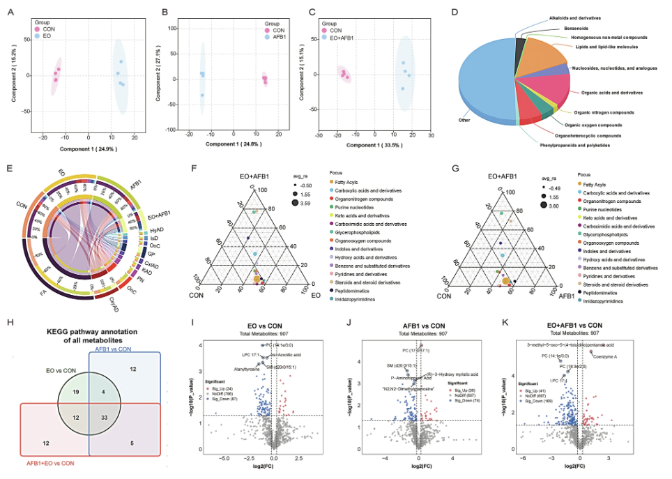 团队通过两周的动物试验发现,AFB1 与类绵羊艾美耳球虫联合可导致羊肉 pH 值异常、肉色苍白、持水能力下降及嫩度降低,肌肉纤维结构出现明显间隙与损伤,从而改变羊肉肉质物理特性;电子鼻分析显示羊肉中烷烃、含硫化合物等风味成分显著减少,引发风味物质失衡。基于以上羊肉品质的变化,进一步通过羊肉代谢组学和转录组学分析,揭示了AFB1和类绵羊艾美耳球虫损害肉质的潜在机制,证实了糖酵解在肉质变化中的关键作用。研究发现AFB1 与球虫通过激活肌肉组织中的 HIF-1α 信号通路,上调糖酵解关键酶 HK2 的表达,可能加速葡萄糖代谢,导致乳酸积累失衡与肉质酸化异常。分子对接实验进一步证实,AFB1 及其代谢物与 HK2 具有强结合亲和力,参与干扰糖酵解过程,从而引发羊肉肉品质指标的异常。该项研究首次以反刍动物为模型揭示了AFB1与EO协同作用损害羊肉品质的潜在毒害机制,建立两者通过“氧化应激-炎症-糖酵解”轴调控肉质的理论框架,为养殖业中球虫病的综合防控和霉菌毒素污染的风险管理提供科学依据。