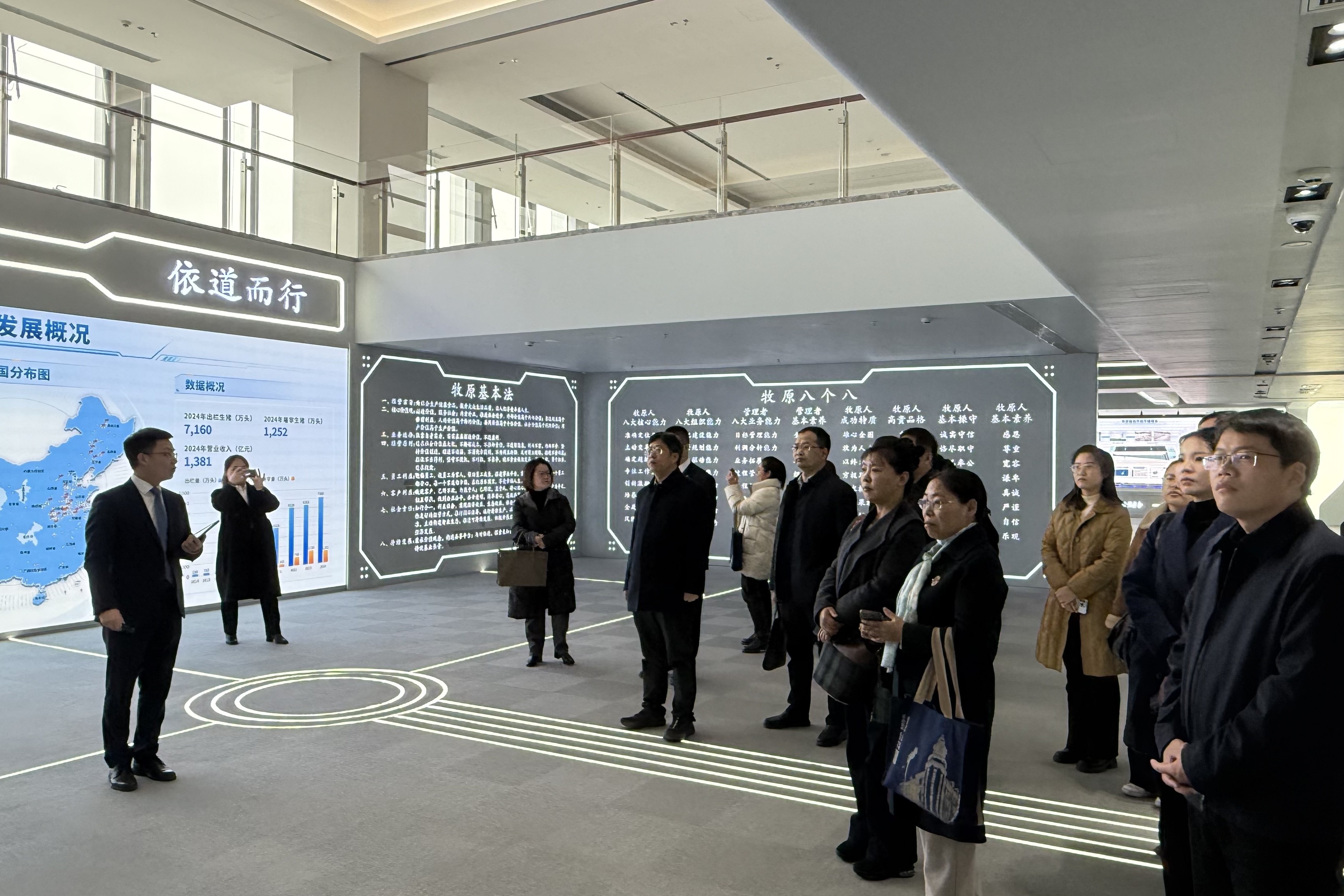 在牧原集团郑州总部,一行人参观了牧原集团展览厅,详细了解了牧原集团的公司理念、发展现状,双方在参观过程中相互沟通,谈论在生产中遇到的实际问题。