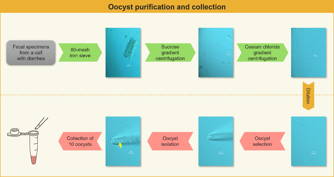 图1:卵囊纯化和收集过程(黄色箭头:微小隐孢子虫)
