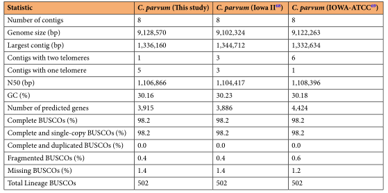 表1:组装的与已发表的微小隐孢子虫参考基因组的比较