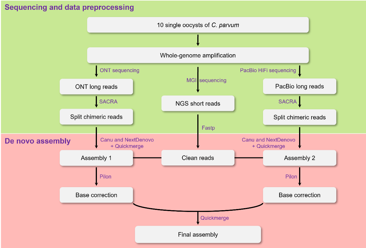 微小隐孢子虫是一种人兽共感染的肠道寄生虫,可引起人类和动物中度至重度腹泻,对人类和动物的健康构成威胁。不幸的是,目前还没有有效的药物或疫苗来治疗或预防隐孢子虫对人类和动物的感染。研究者们试图通过基因组研究去优化抗隐孢子虫药物开发和疫苗设计。然而,隐孢子虫难体外培养、难大量获取制约了隐孢子虫基因组测序的发展。为了解决这一挑战,我们给出了单卵囊全基因组扩增和长读测序技术相结合的方案。