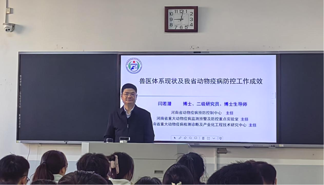 在报告会上,闫若潜研究员深入且系统地阐述了我国兽医管理体系的构建框架,其核心职能,以及在检测检验和疫病防控等领域的技术支撑作用。他详细地介绍了国家动物疫病防控工作在保障畜牧业稳定、维护公共卫生安全等方面的重大意义。对于河南省动物疫病防控机构,他剖析其当下的人员架构、资源配置等状况,也对河南省动物疫病预防控制中心在疫情监测、应急处置等方面取得的工作成果予以呈现。最后,聚焦兽医人才培养,他深入探讨新时代下,兽医专业人才需具备的跨学科知识、创新科研能力以及高度的职业责任感等需求。会后,闫若潜研究员与参会师生进行了深入交流。(文/李俊强)