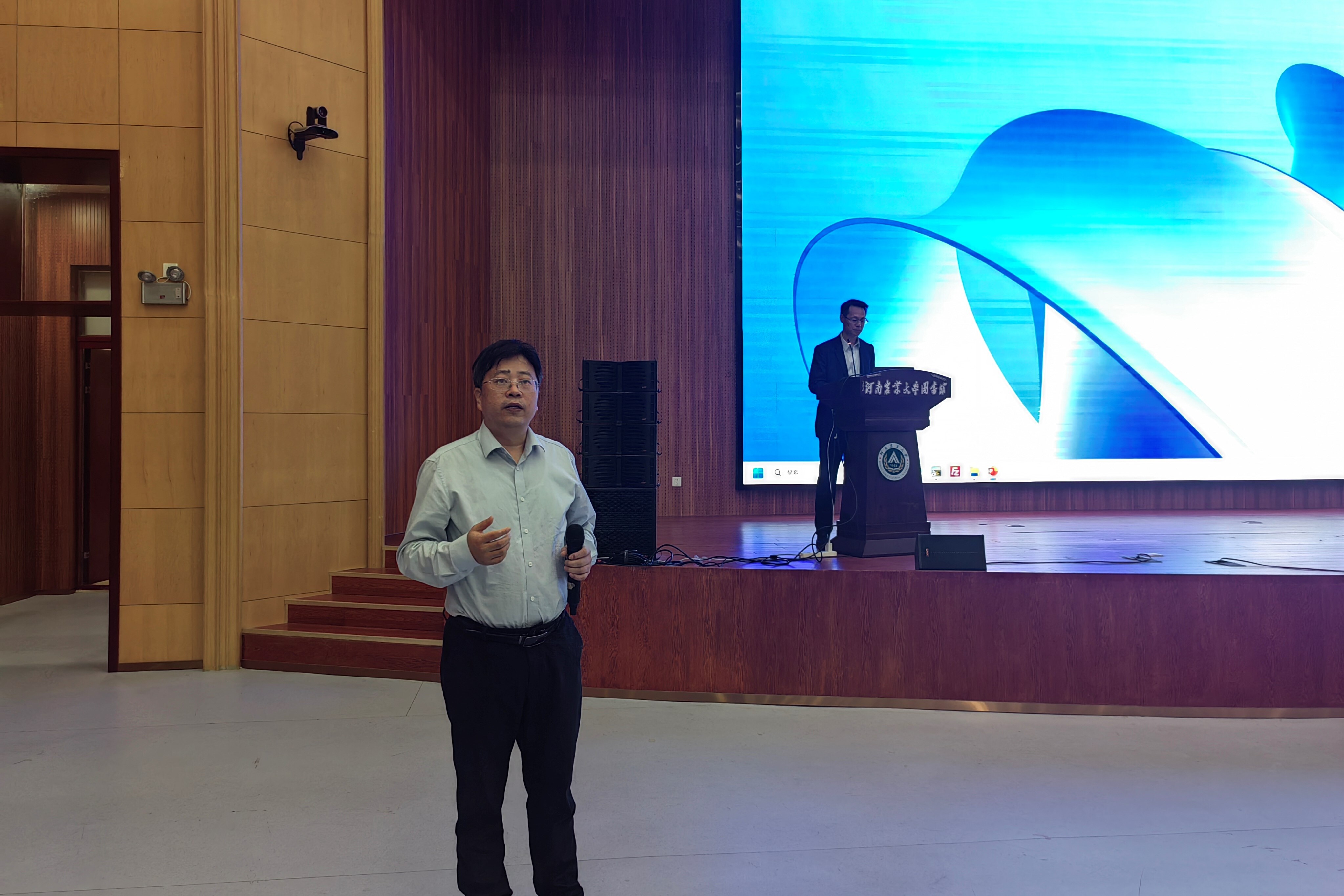 9月25日下午,华中农业大学曹胜波教授应我院邀请,为中国现代农业联合研究生院及我院师生作了题为“人兽共患病源头防控”的精彩报告。报告会在图书馆一层报告厅举行,中国现代农业联合研究生院和我院共计200余名师生参与报告会。会议由许昌校区执行校长、动物医学院教授魏战勇主持。