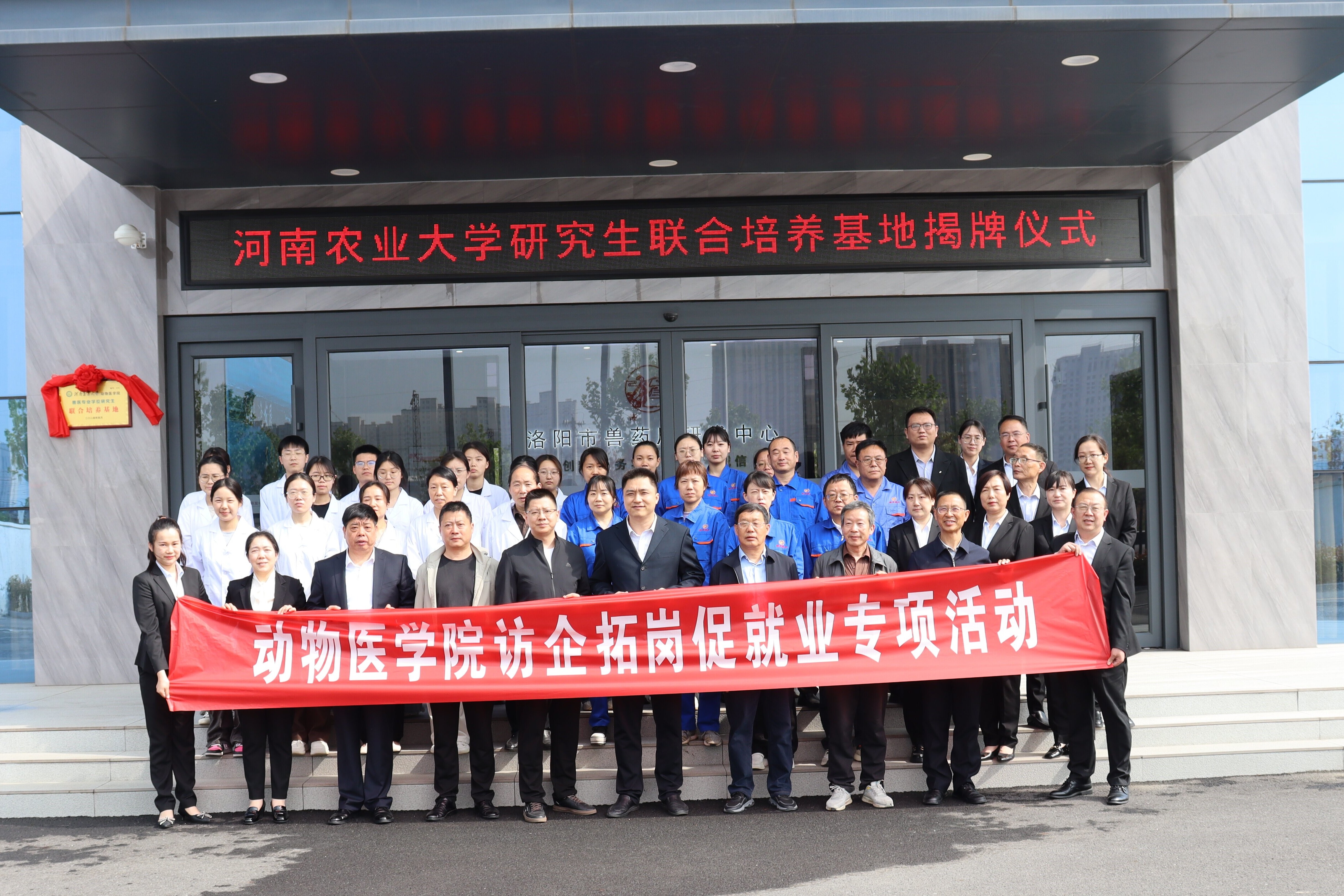 2024 年 4 月 17 日上午,我院和洛阳市兽药厂签定本科生、研究生联合培养基地合作协议,举行揭牌仪式,并与企业进行座谈,开展访企拓岗活动。洛阳市偃师区政协党组成员,二级调研员史书通,洛阳国裕集团公司、偃师区科技局、偃师区农业农村局的相关领导出席了活动,我院副院长韩立强和赵军教授参加活动。
