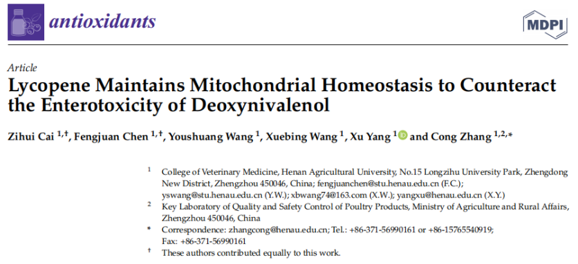 为了切实做好新时代下高校大学生全面发展工作,推进教育部“高等学校教学质量与教学改革工程”,实现对本科生因材施教和个性化培养,提高人才培养质量。我院成立了新农科拔尖创新班,并采用“一对一”的学业导师制来进行培养模式。近日,我院创新班本科生培养取得新成果,20级创新班本科生蔡子慧在导师张丛的指导下,在番茄红素缓解霉菌毒素肠损伤机制方面取得新进展并在中科院二区期刊《Antioxidants》(IF=7.0)上发表了题为“Lycopene Maintains Mitochondrial Homeostasis to Counteract the Enterotoxicity of Deoxynivalenol”的学术论文。该研究为寻找呕吐毒素肠毒性治疗靶点提供了新的线索,同时也提示番茄红素可作为线粒体稳态的靶向调控药物应用于畜禽养殖中,为解决我国多功能饲料源毒素解毒剂缺乏的难题提供新思路。