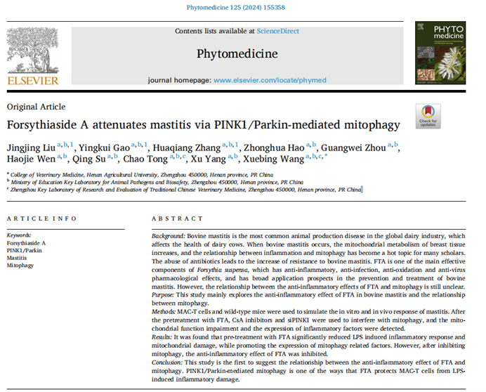 我院王学兵教授团队在中科院医学药学领域一区TOP期刊《PHYTOMEDICINE》(IF7.9)上发表了题为“Forsythiaside A attenuates mastitis via PINK1/Parkin-mediated mitophagy”的学术论文。该研究为寻找乳腺炎治疗靶点提供了新的线索,同时也提示连翘酯苷A可作为线粒体自噬的靶向调控药物,为奶牛乳腺炎的防治提供新思路。