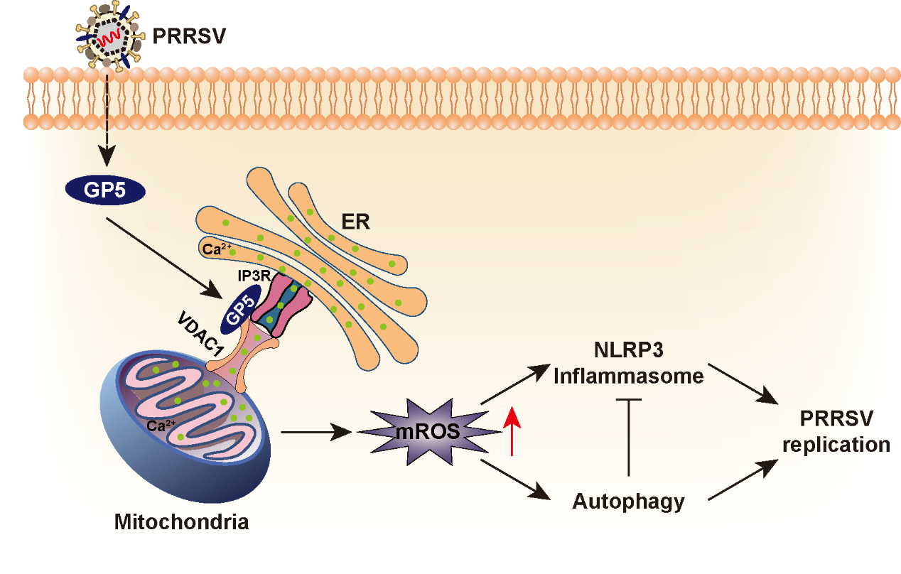 猪繁殖与呼吸综合征病毒(Porcine Reproductive and Respiratory Syndrome Virus, PRRSV)严重威胁我国及世界养猪业健康发展,迄今仍未取得实质性控制。解析PRRSV增殖的分子机制对于安全高效的新型疫苗设计和抗病毒药物研发具有重要的科学意义。我院动物生物技术团队褚贝贝教授课题组在国际著名学术期刊mBio在线发表了题为“The glycoprotein 5 of porcine reproductive and respiratory syndrome virus stimulates mitochondrial ROS to facilitate viral replication”的研究性文章。