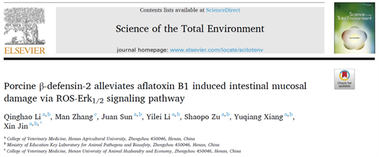 近日,我院动物分子病原学团队在环境科学与生态学1区TOP期刊《Science of the Total Environment》(IF=9.8)上在线发表了“Porcine β-defensin-2 alleviates aflatoxin B1 induced intestinal mucosal damage via ROS-Erk