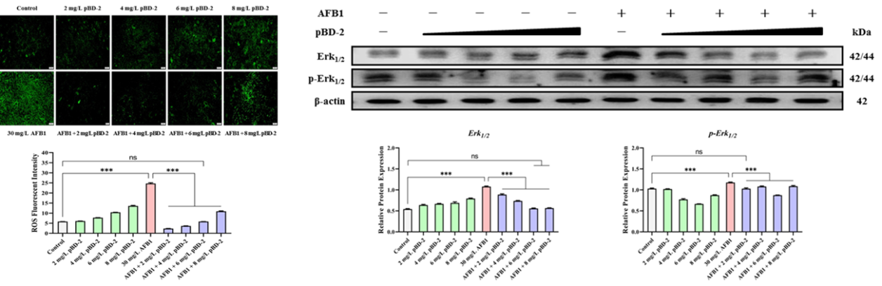 图5. pBD-2显著降低了AFB1导致的ROS积累进和Erk1/2表达与磷酸化升高