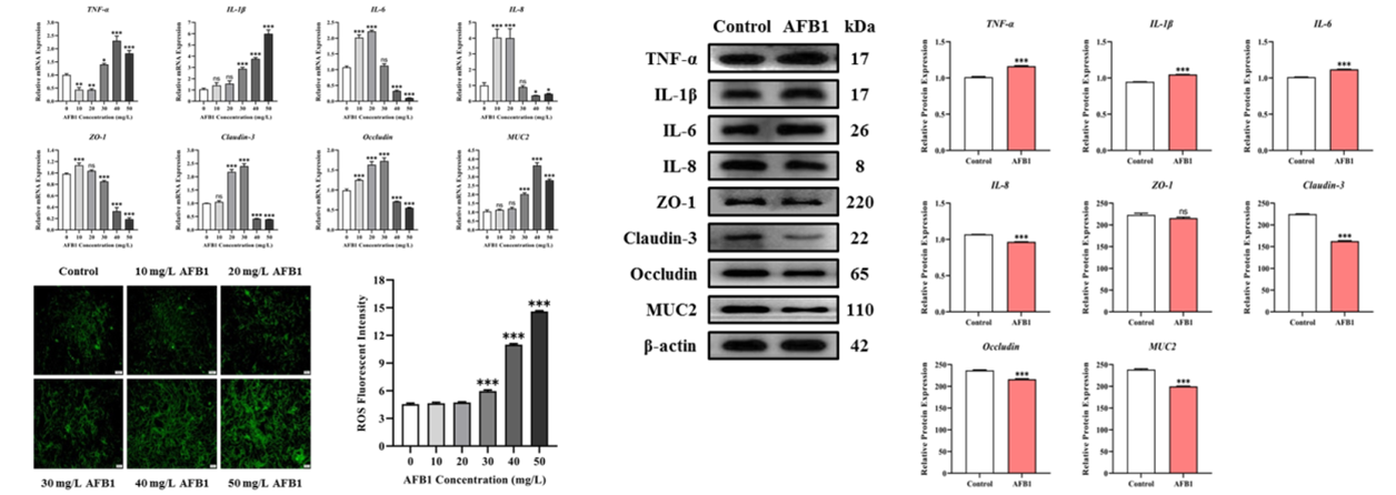 研究团队以不同浓度的AFB1处理IPEC-J2细胞,ROS及细胞因子与屏障蛋白的检测结果显示:AFB1对细胞造成的氧化损伤呈剂量依赖性,综合各细胞因子及蛋白的表达变化,30 mg/L AFB1对细胞的影响最大。经过蛋白表达验证,30 mg/L AFB1显著提高了促炎细胞因子的表达,降低了紧密连接蛋白与黏蛋白的表达,表明AFB1通过诱导氧化应激,刺激细胞炎症反应的同时,破坏了上皮屏障(图2)。