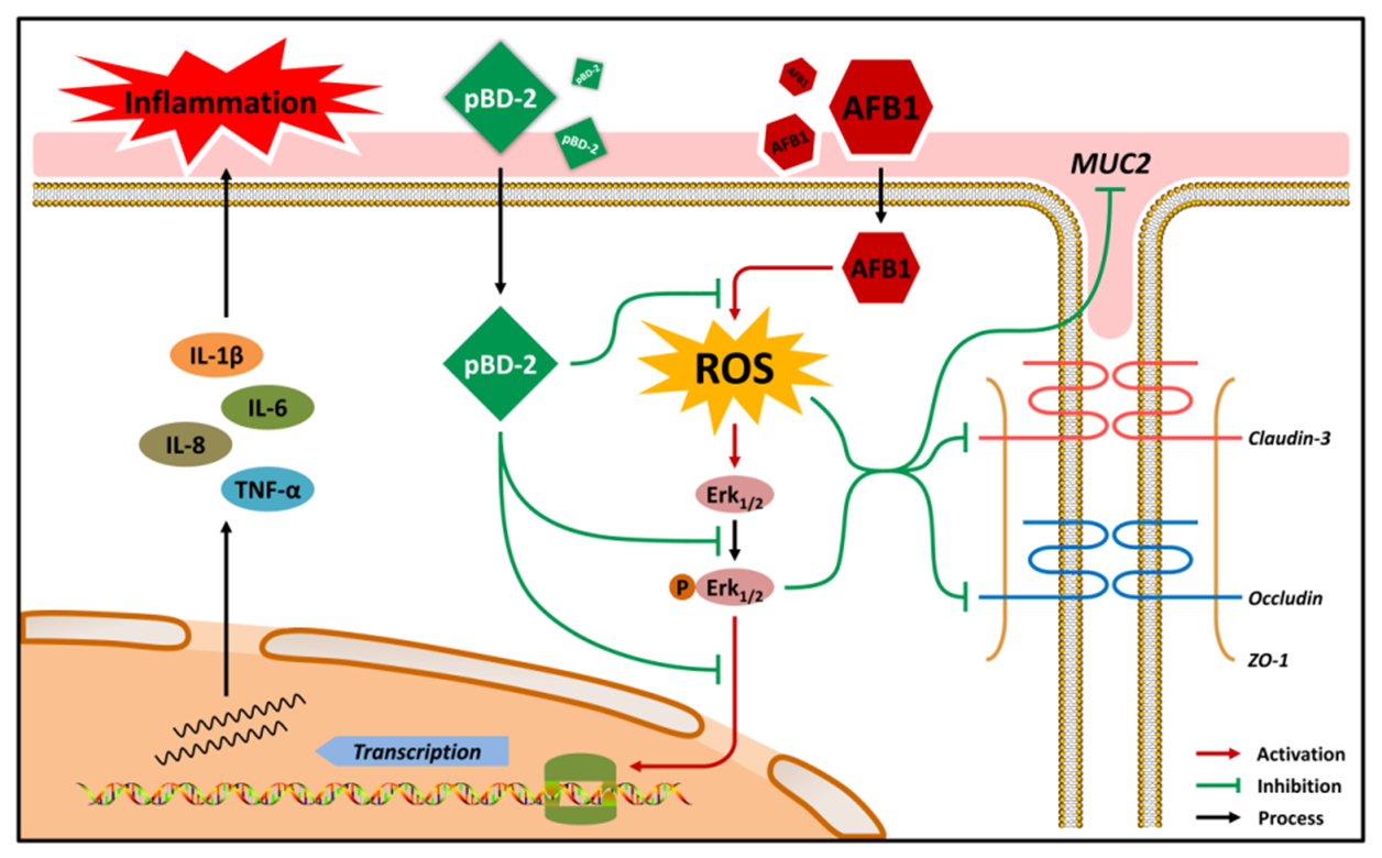 1/2信号通路,促进炎症反应,破坏紧密连接,干扰黏膜屏障,降低动物饲料转化率和ADG,pBD-2通过阻断ROS-Erk