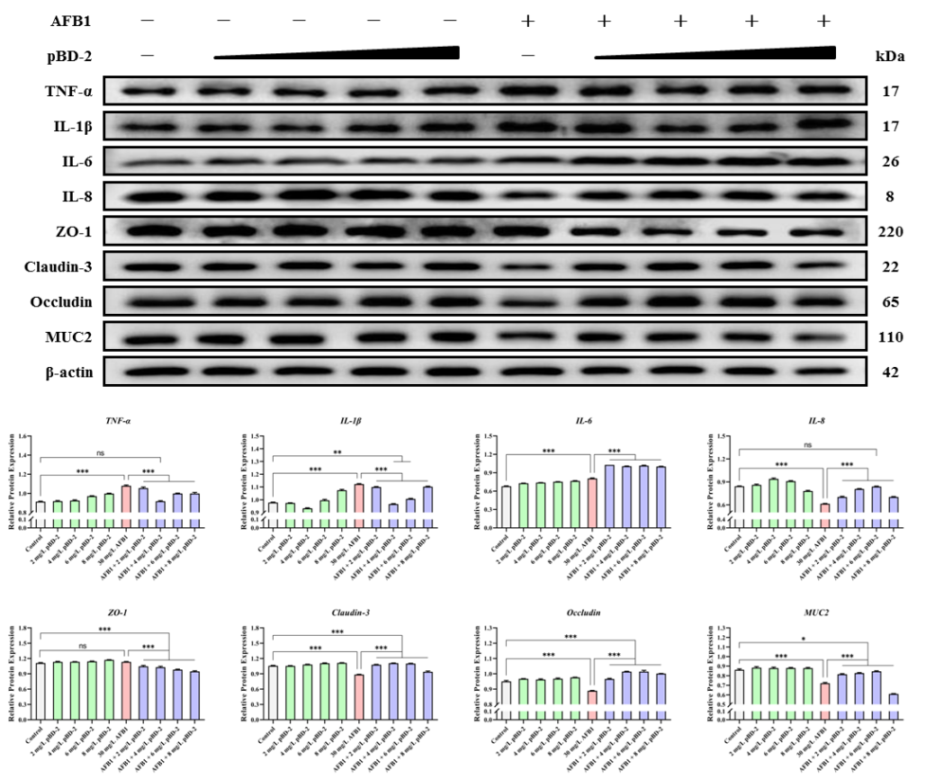 图3. pBD-2缓解AFB1诱导的IPEC-J2细胞炎症反应并修复黏膜屏障