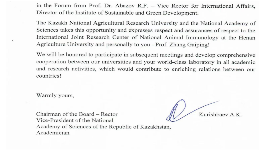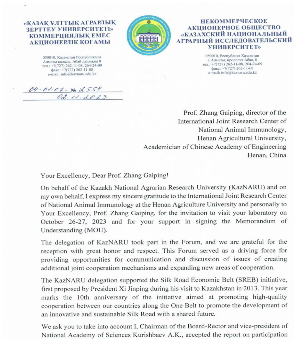 10月27日,哈萨克斯坦国立农业大学副校长阿巴佐夫·拉菲斯教授携访问团来郑参加“第三届中国·河南开放创新暨跨国技术转移大会”,我院龙湖现代免疫实验室与哈萨克斯坦国立农业大学共同签署了合作协议。