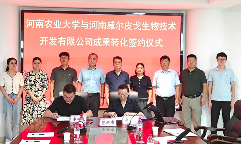 8月21日,河南农业大学与河南威尔皮戈生物技术开发有限公司成果转化签订仪式暨本科生与研究生校外实习基地签订仪式在龙子湖校区举行。河南威尔皮戈生物技术开发有限公司董事长秦月超、总经理李炳晓、技术总监古宏杰,校社会服务处副处长王春丽,院长张龙现,动物病原与生物安全教育部重点实验室胡慧教授及团队成员参加签约仪式,仪式由张龙现主持。