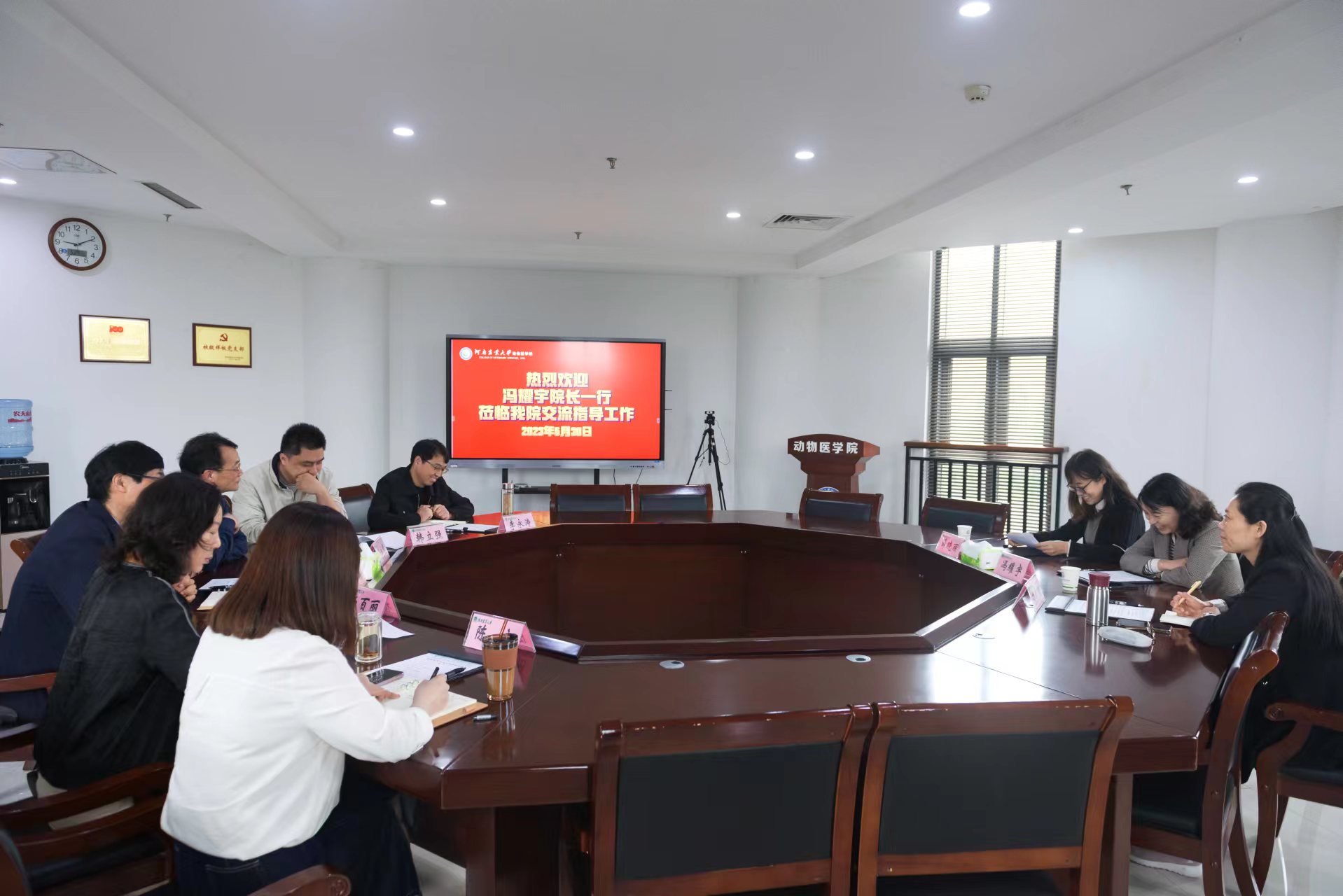 5月30日上午,华南农业大学兽医学院院长冯耀宇、党政办公室主任薛晓丽、学科办主任刘毅新一行3人莅临我院座谈交流,座谈会在第一实验楼401会议室进行。学院党委书记廖仲磊、院长张龙现、副院长杨百丽、副院长韩立强出席了座谈会。学院党政办公室负责人及部分教师代表参加了座谈会。座谈会由廖仲磊主持。