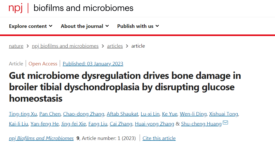 该研究以题为 “Gut microbiome dysregulation drives bone damage in broiler tibial dyschondroplasia by disrupting glucose homeostasis” 的研究论文在线发表在微生物领域国际著名期刊npj Biofilms and Microbiomes(中科院一区TOP),我校动物医学院硕士研究生徐婷婷为论文的第一作者,黄淑成为论文的通讯作者。同时,我校刘芳副教授和校青年英才张怀勇等参与了该工作。该研究得到国家自然科学基金(32202876, 32102732),中国博士后科学基金(2020M672234),河南农业大学青年人才(30500421)等项目的联合资助。(文/黄淑成)