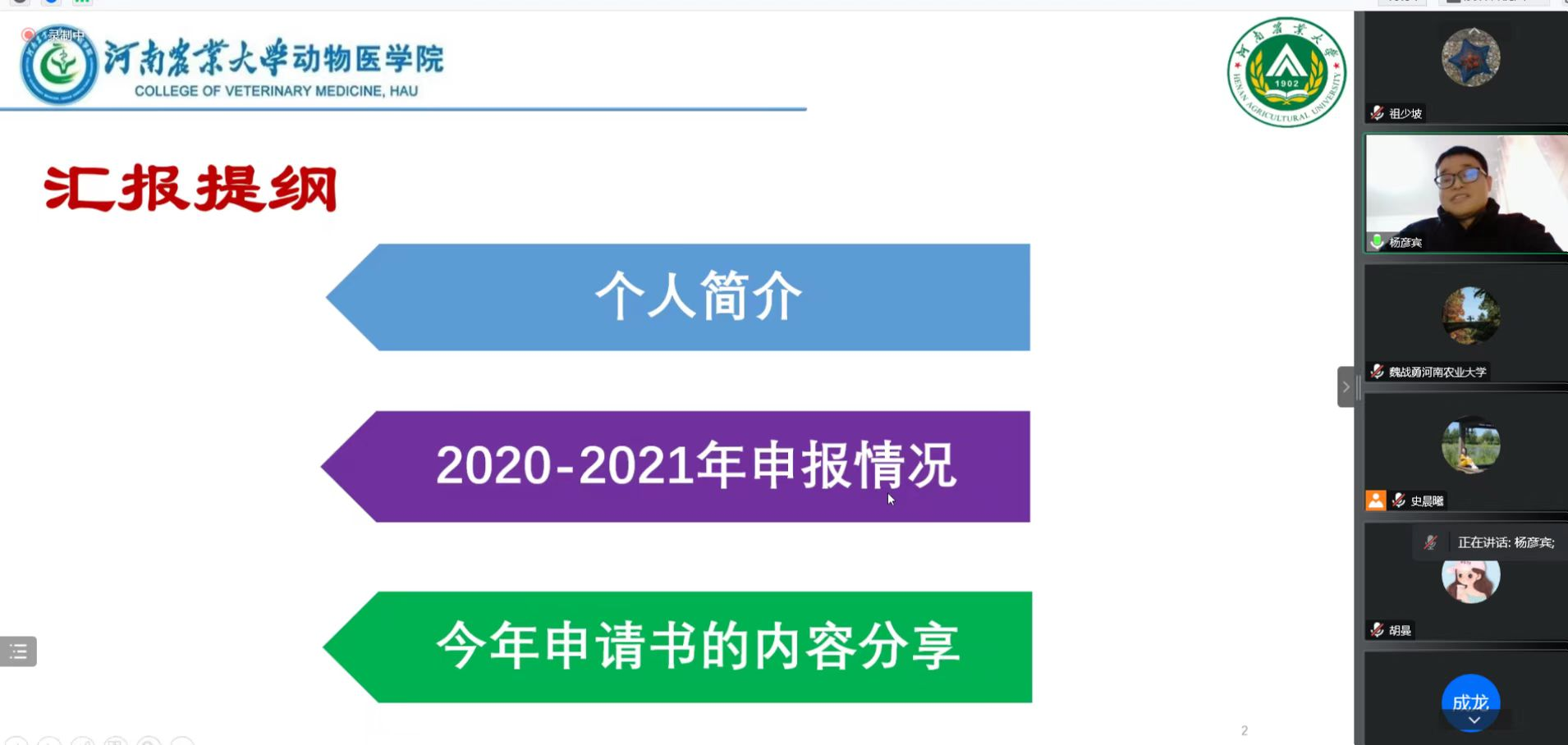 会上邀请我院2022年青年基金项目获得者杨彦宾老师作了基金申报的经验分享。杨老师首分享了自己往年跨学科申请项目的心路历程,对今年已中的项目进行了详细汇报。报告会上老师们提出如何才能更好进行学科交叉,杨老师结合自己的亲身体会给出了详细解答,与会老师们都感受到了学科交叉融合的重要性,并表示一定要开拓视野,努力实现兽医学科与其他学科的交叉融合。