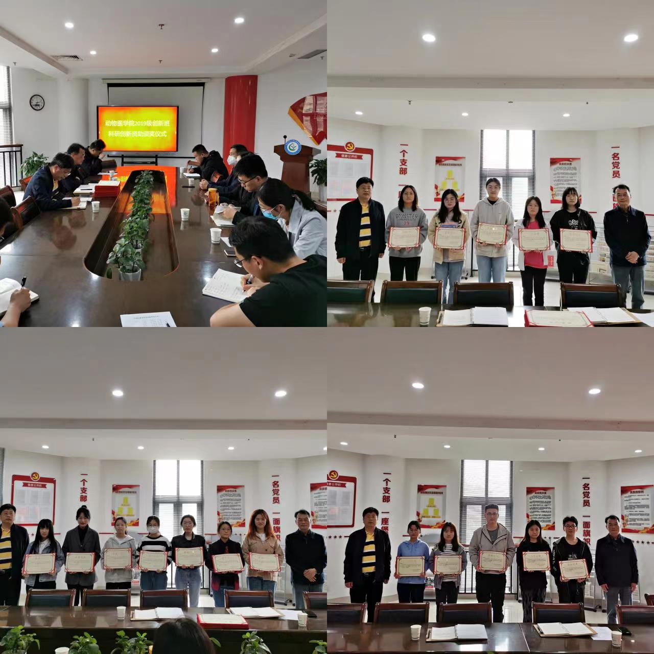 4月27日下午,我院在第一实验楼北430会议室举行2019级动物医学创新班科研创新资助颁奖仪式。院长张龙现、副院长魏战勇、教学秘书韩立强出席颁奖仪式。2019级部分学业导师、2019级创新班全体同学参加了颁奖仪式。颁奖仪式由韩立强主持。