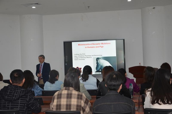 日前,奥本大学陶亚雄教授应我院邀请,在第一实验楼北530会议室为我院师生开展了题为《Melanocortin-4 receptor mutations in human and pigs》的学术交流讲座。学院相关教师、博士研究生、硕士研究生参加报告会。会议由动物生产系统与工程系主任田亚东教授主持。