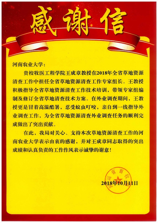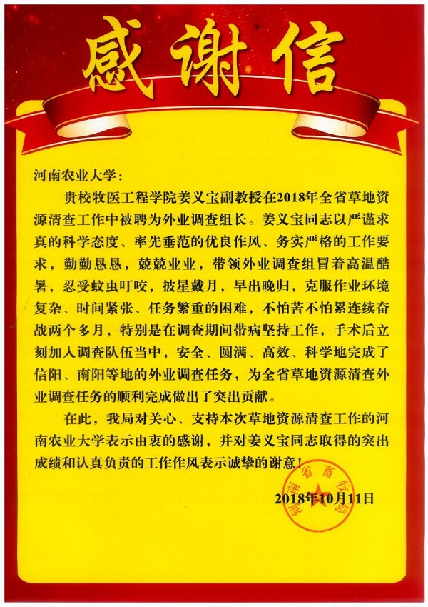 日前,我院收到来自河南省畜牧局的感谢信,对我院教师王成章、姜义宝在2018年全省草地资源清查工作中所做的出的贡献表示感谢,对他们严谨求真的科学态度、率先垂范的优良作风、务实严格的工作要求、吃苦耐劳的工作精神给予高度评价。他们的表现也展示了我们牧医人的风采。(文/韩笑)
