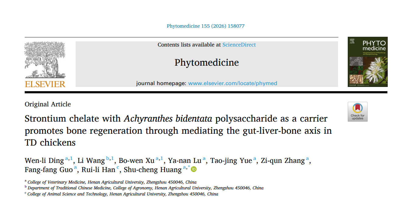 近日,我院黄淑成副教授课题组,在中药药理学领域国际期刊《Phytomedicine》在线发表题为《Strontium chelate with Achyranthes bidentata polysaccharide as a carrier promotes bone regeneration through mediating the gut-liver-bone axis in TD chickens》的研究论文。该研究从肠-肝-骨轴视角系统阐明了牛膝多糖-锶螯合物修复肉鸡胫骨软骨发育不良(TD)的调控机制,为家禽骨病绿色防控及功能性饲料添加剂研发提供了理论依据与技术支撑。