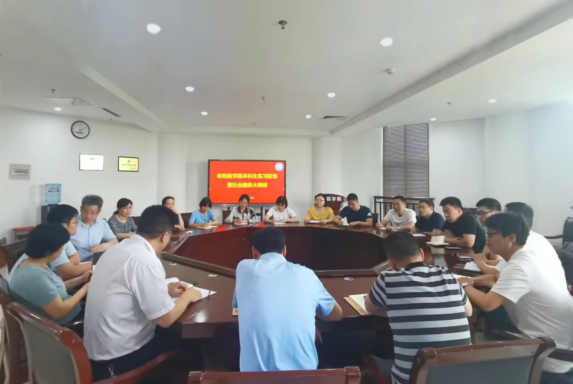 6月15日下午,动物医学院本科生实习教师驻场暨社会服务大调研在第一实验楼北401会议室召开,院党委书记廖仲磊、副书记杜家方、副院长韩立强及学院教师代表参加会议。